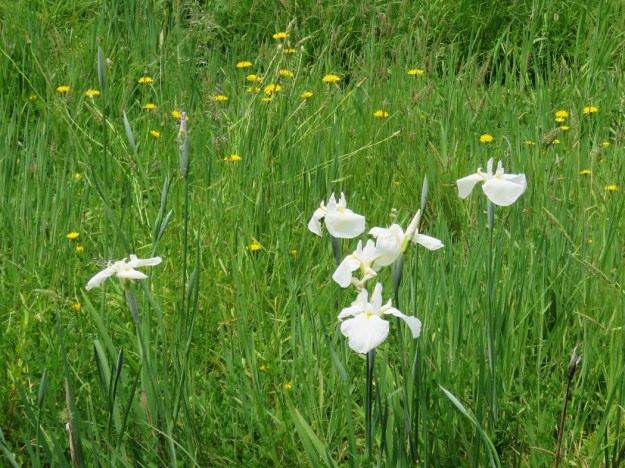 Higo iris float above a sea of dandelions in the Wild North Garden