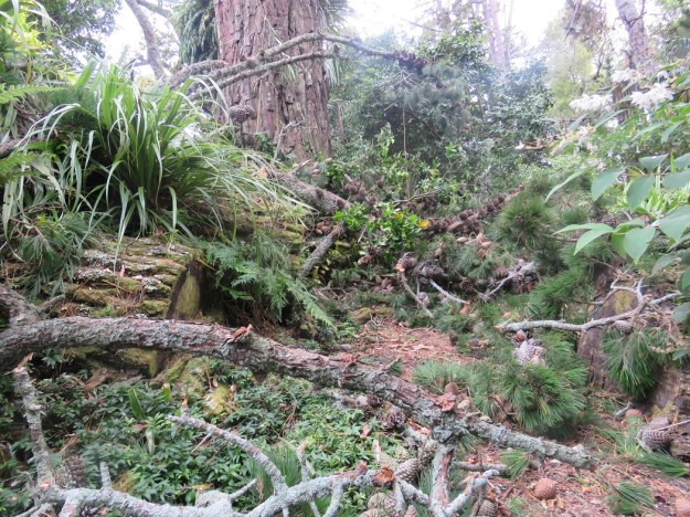 As usual, we will gather all the pine cones and get out what firewood we can but it appears that there is some surrounding damage this time.  We are philosophical. It is just part of gardening beneath huge trees that are now up to 145 years old. The fallen epiphytic collospermum may be a clue as to why the branch fell. There will be a big weight in just that chunk of vegetation sitting on the branch. The birds spread the seeds and they can germinate, grow and hang on for grim death up high.