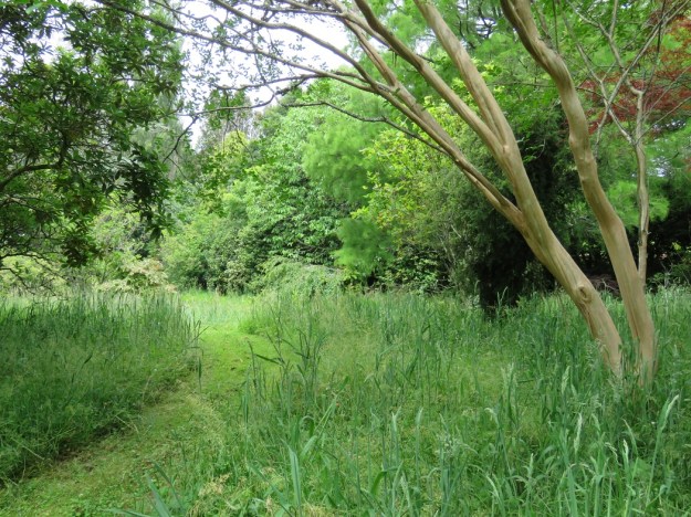 Mown paths through the meadow. The clean bark on the right is a crepe myrtle