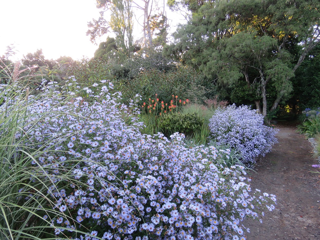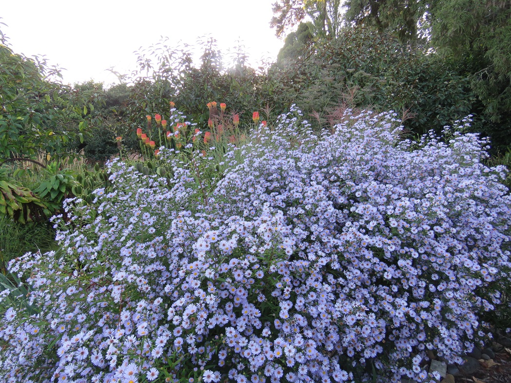 We have maybe half a dozen other named cultivars of asters in shades of blue and pink and they are fine. They are all hybrids, not species, and while they will form a fairly dense surface mat of roots, they are not invasive in the same way. And they do tend to have stronger stems so hold themselves upright, even the ones that are waist height.