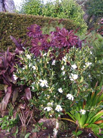 Compact C. drupifera, planted here with burgundy aeonium and cordyline