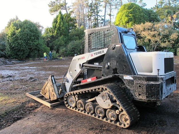 Lloyd can be spotted at the back of the photo with the tractor, our fancy lawnmower towing a large trolley, screeding tool, shovel, rake, barrow and plate compactor. This is not a job for the fainthearted.