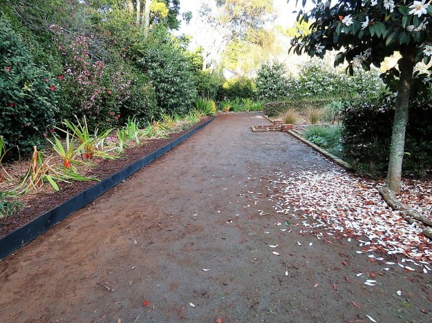 With our lives becoming so much more home-based, local and smaller – holding the chaos of the world at bay – the garden has become even more important. This week, I ordered the first truckload of the top layer for the paths in our new summer gardens. Ten cubic metres or fourteen ton to start with and we will need at least as much again. It is not cheap so there was some nervousness but we are pretty excited at the effect of this crushed limestone and shell mix (I did say our world had grown smaller!). Lloyd is spreading it by barrow, shovel and rake, screeding it and then using the plate compressor to compact it as he goes. A torrential downpour was a good test. It compacts suffciently firmly that the torrent of ground water did not wash it away and the surface is so smooth that it can be swept or cleaned with the leaf blower. The rain brought the whiter fines to the surface so the finished effect looks more like the terrazzo kitchen benches of long ago. After building up to this for so long, it is positively thrilling, I tell you.