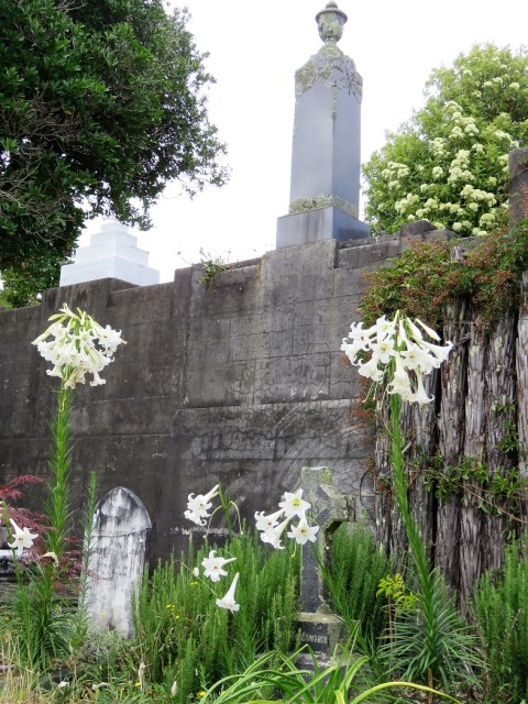We had been talking about Lilium formasanum the previous day. While it is regarded as a weed in this country and banned from sale, we are quite happy to let it pop up around our place. It is one of those plants that I think in time we may come to accept as a permanent addition to our environment. I assume its weed status is on account of its seeding ways and its ability to pop up in all sorts of situations. We are increasingly of the view that we must learn to live with many of these interlopers and only wage chemical warfare on those that endanger our natural flora – the likes of Clematis vitalba (old man’s beard), Japanese knot weed and, in the area where we live, giant gunnera and pampas grass. The Formosan lily was looking right at home and picture perfect amongst the graves. It is a beautiful flower, though without the heady fragrance of many other lilies.