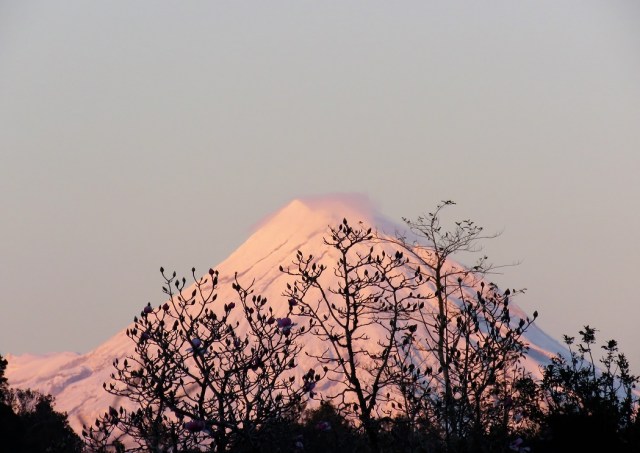 I was prophetic. Just two weeks ago I commented that bringing in a film crew from outside the area to capture our view of Magnolia campbellii and Mount Taranaki was fraught with problems, that we could go ten days without being able to see it. In fact it was fourteen days this time – a period of cloud and intermittent rain which kept te mounga shrouded. Yesterday was fine and sunny and the cloud over the peak cleared in the afternoon. Is there a lovelier sight?
