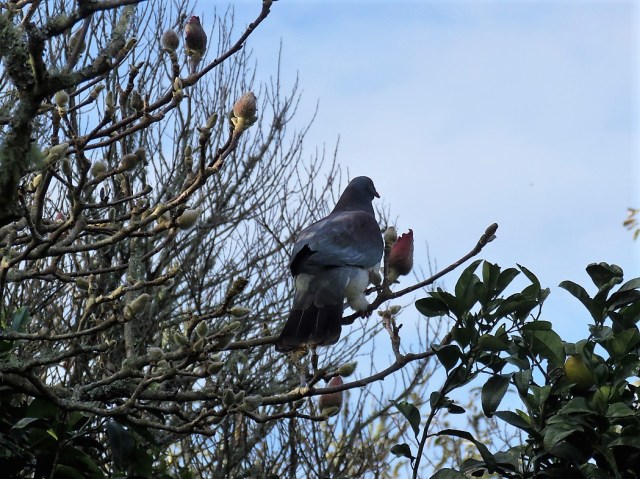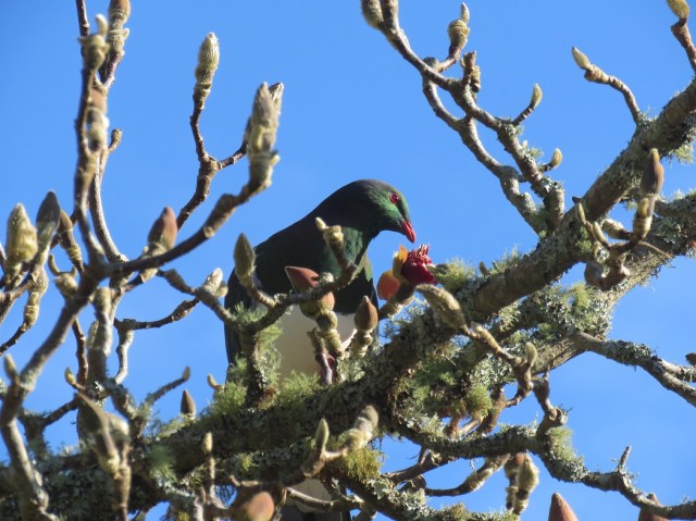 Absolutely shameless, this kereru was, eating the magnolia buds as we watched