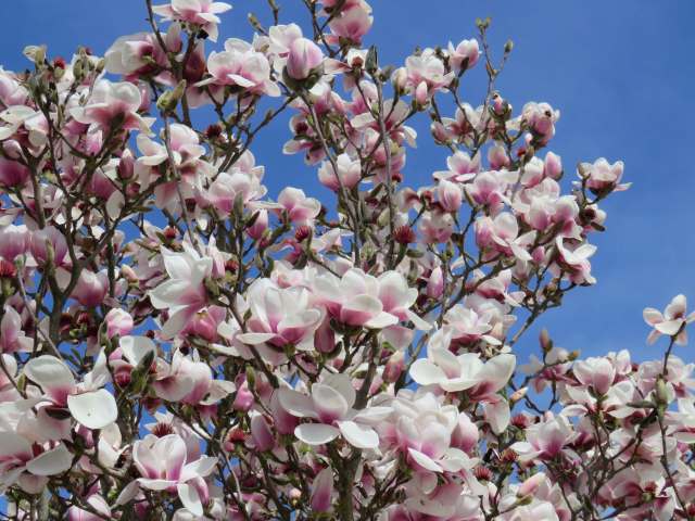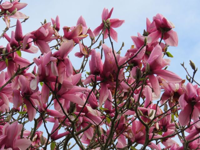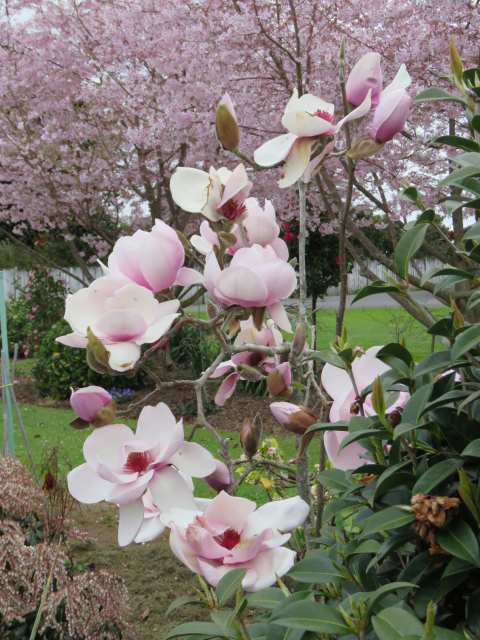 A few doors down from Pat and Brian’s home is a house with this little Magnolia ‘Iolanthe’ in bloom – showy enough for me to stop the car and photograph from the roadside. The plant can only have been in the ground two or three years and I haven’t noticed it in flower before, although there is a young plant of ‘Felix Jury’ a few metres away in the same garden that catches my eye when in flower, every time I drive past. But look at ‘Iolanthe’ strutting her stuff! I counted around 30 blooms and opening buds on this very small plant.