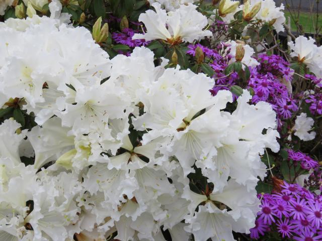 Pat’s plant of Rhododendron veitchianum. It wasn’t until I got up close to it that I realised the striking colour contrast was cineraria.