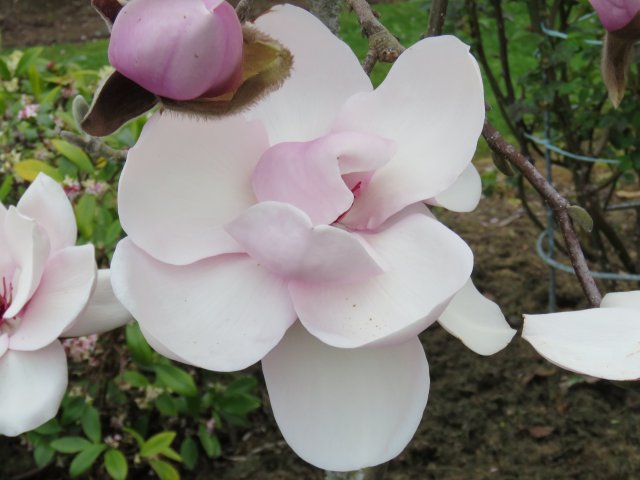 What makes these magnolias interesting to us is that Pat and Brian garden very differently to how we do. The magnolias are planted in the open, exposed to pretty much every wind that blows. They are not mulched and the ground around them is kept bare. They are not trimmed or clipped. I would guess that they were well fertilised when getting established but are now left to their own devices. In those exposed, open conditions,  they are performing better than many of the ones we have here in our own garden which is sheltered from most winds.