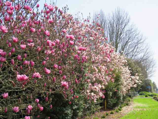 The thing about this row of magnolias is that its purpose is to delight passers-by. The owners, Pat and Brian, can’t see it from their house which is on the adjacent section. Pat, in particular, is a keen gardener and they keep a detailed and heavily ornamented garden around the house but the row of magnolias is for the benefit of passing traffic, be it in vehicles or on foot.