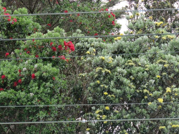 The red pohutukawa make better landscape trees but the yellow is certainly an interesting variant, plus power lines