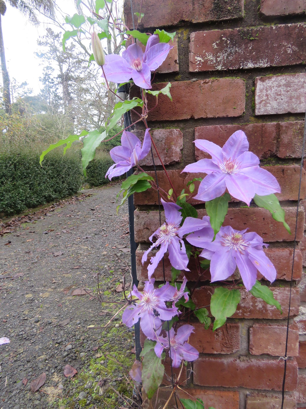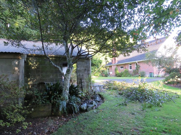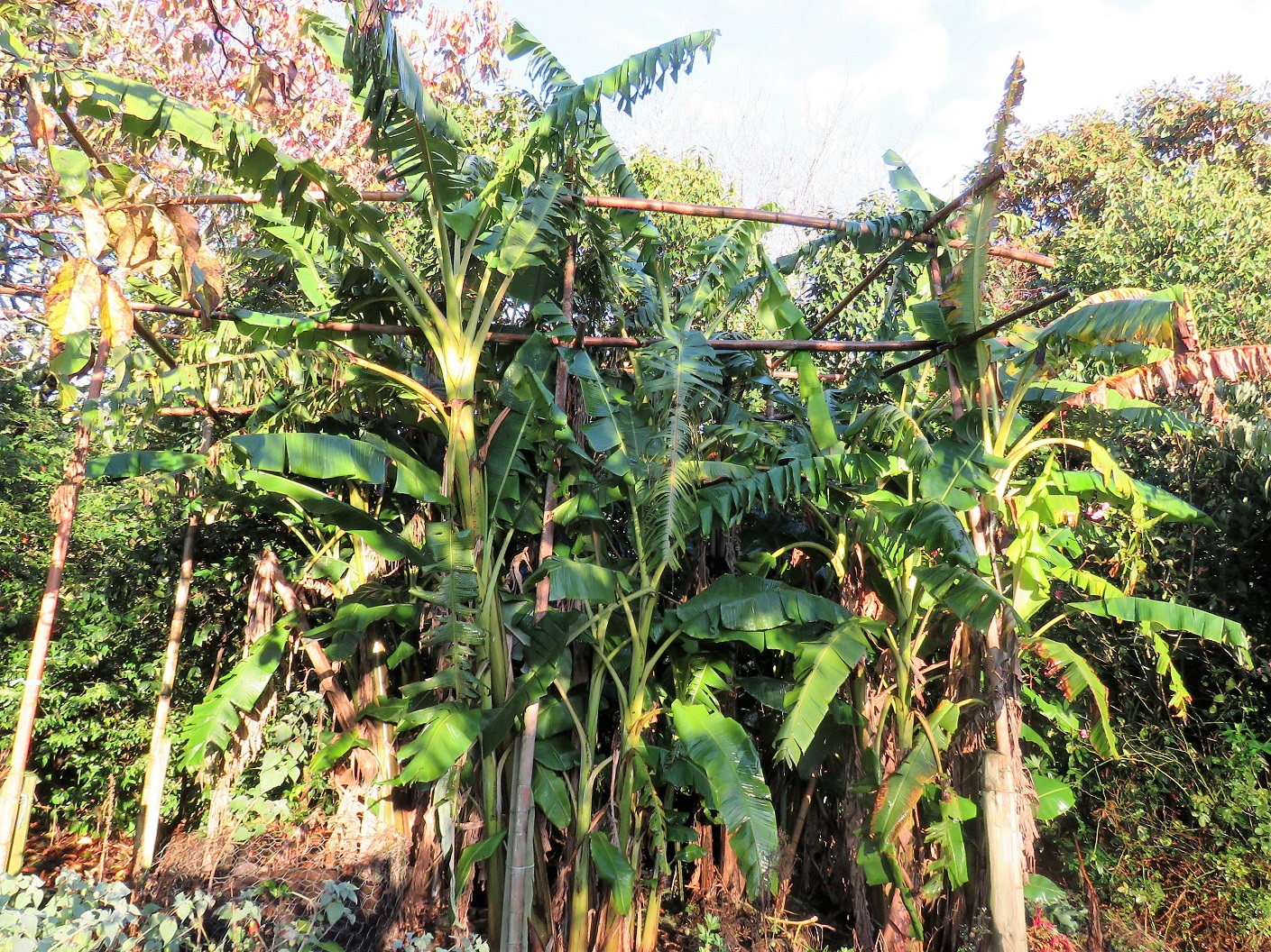 This too will pass. Generally the worst of our winter weather hits after the winter solstice – June 22nd to be precise – and today, June 2, has dawned fine and sunny, albeit with a chilly temperature. Mark is taking heed of this sudden drop. Today’s task, he declared, is to cover the bananas. You can see the semi-permanent bamboo frame in the photo. He needs the extension ladder these days to get the windbreak sheltering cover in place for the bananas have grown to a substantial size. At least we get a crop from them these days but we wouldn’t if he didn’t spend a day shrouding them for winter. That is as far as battening down the hatches goes here. We don’t wrap anything else up for winter.
