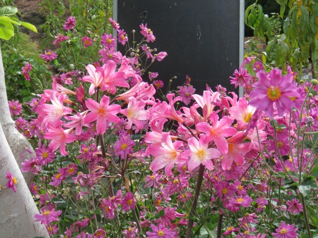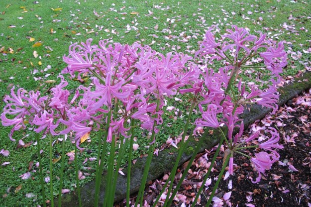 There is nothing too special about Nerine bowdenii. It is the last of the autumn season to flower for us. We have a particularly attractive patch which is a delight every year, planted on the edge of the main lawn, just beneath Camellia sasanqua ‘Elfin Rose’ which is more or less the same shade of sugar pink.