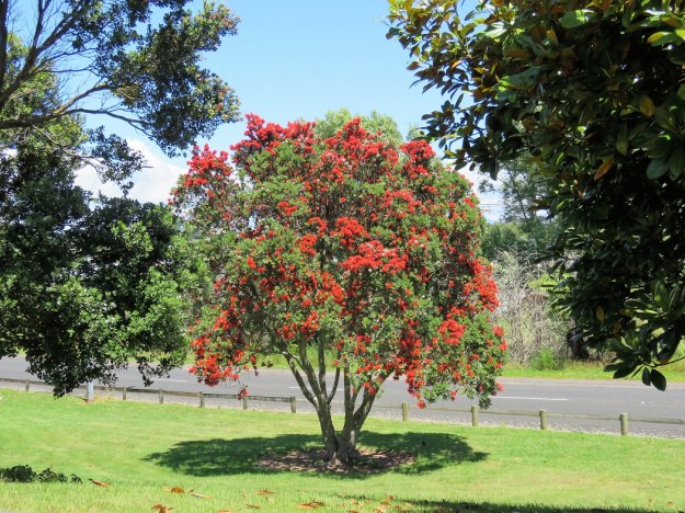 The story of a New Zealand Christmas is inextricably bound up with the annual blooming of our native pohutukawa trees – Metrosideros excelsa. Truth be told, they only occur naturally as far south as northern Taranaki where we live and Gisborne across the island, (but not in the middle where it is too cold for them). Fortunately, most of the country is happy to go with descriptor of the New Zealand Christmas tree.