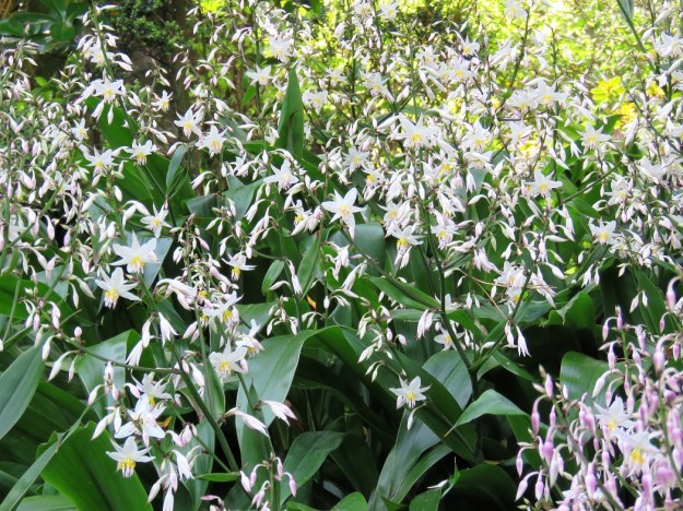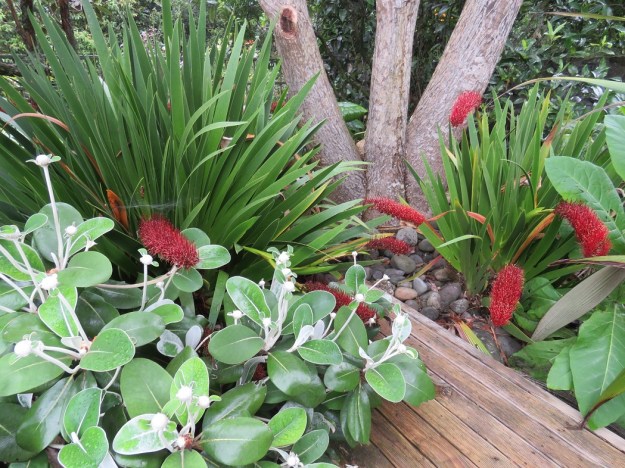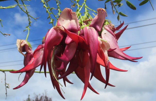 The tecomanthe is climbing vine, subtropical and therefore frost tender but well adapted to coastal conditions. Its foliage is relatively large, lush and shiny and I can’t get a photo because it is all right up on top, maybe 10 metres above. Fortunately, it doesn’t only flower right at the top but can put clusters of blooms out on its bare lower lengths of vine.