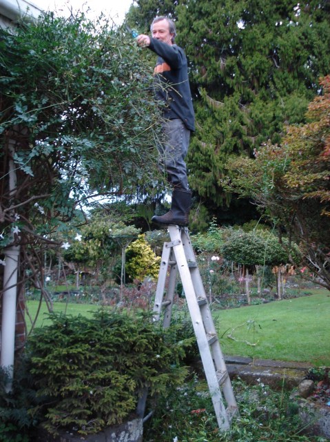 Mark, being an agile and wiry man with very good balance, has given me the most alarming photos of how not to use ladders. Do not try this at home. He would like a disclaimer added that he is not stupid. He only does this with the ladder in a stable position and with something firm to hand that he can grab should anything go awry. Never with the chainsaw. He is extremely mindful of safety and caution with the chainsaw when mistakes can be fatal.