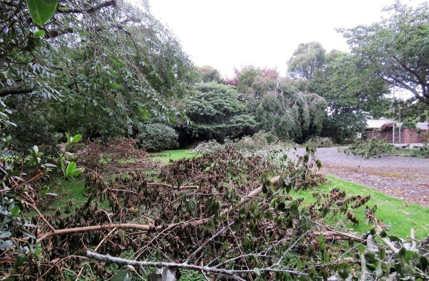 In a garden with many trees, ladders are a part of our life. While our son, Theo, and I have been down in the park clearing the ponds and the stream of invasive weeds (lots of heavy raking), Mark has been up the top doing a round of summer pruning. Particularly cherry trees which need to be pruned right now, since summer is already morphing into autumn. You can see the extension ladder up Prunus Pearly Shadows to the right of the photo.