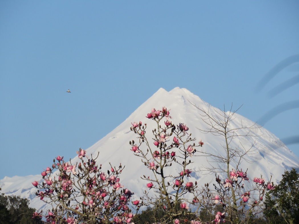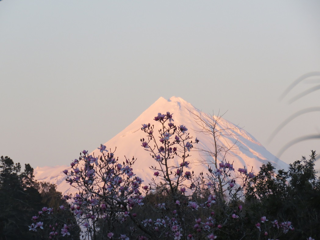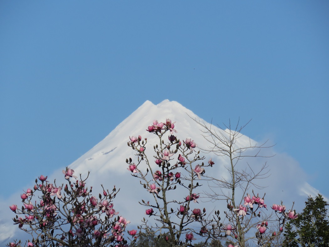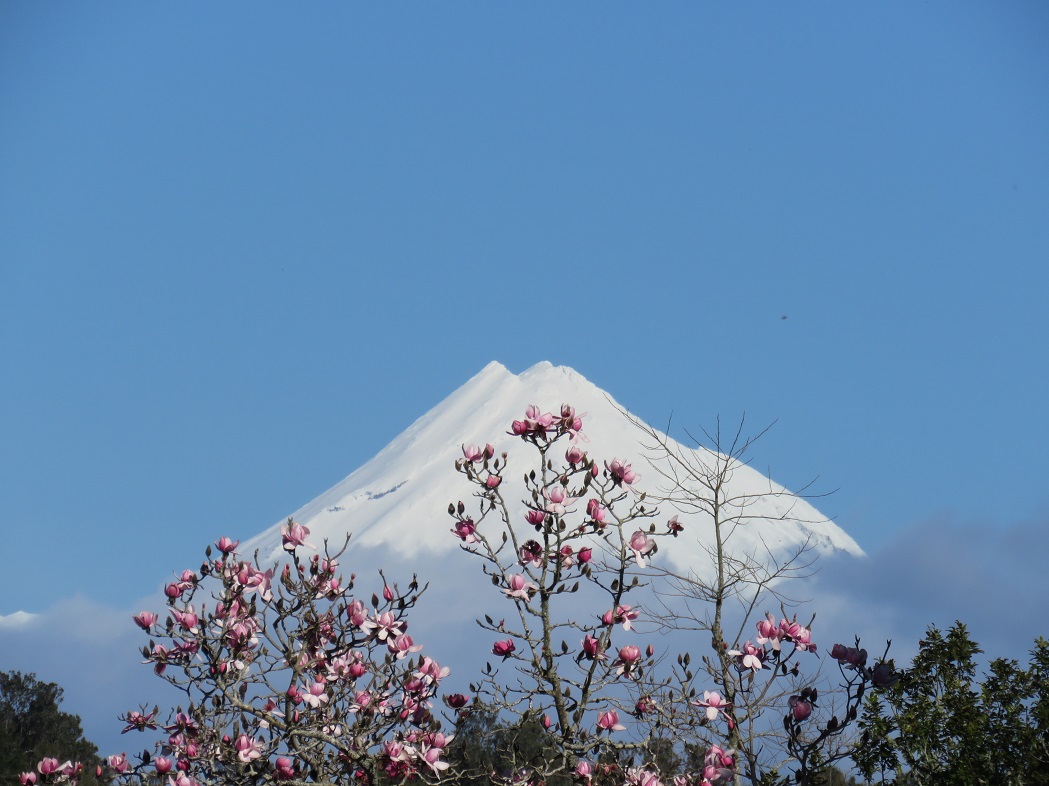 I rushed out at 7.40am on Monday because the day had dawned sunny, clear and calm and I thought the mountain should be in view. We only have one really good view from the garden and at this time of the year, Magnolia campbellii is in bloom in our park. It being just past mid winter here and the subject being a mountain, it is more often shrouded in cloud. We are inclined to get apologetic about this in Taranaki but I remember driving round the South Island with our son some years ago. We never once saw the Southern Alps and that was down the east coast and up the west coast in January. Mountains attract cloud which is all the more reason to celebrate the winter view when it is revealed.