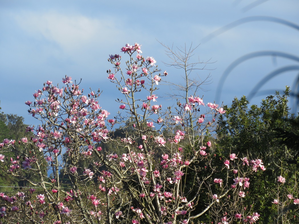 I think the tree in the grounds of St John the Baptist Church is Waitara is matching it for open blooms. All these trees are in sheltered positions, very close to the coast and, being urban, surrounded by large amounts of concrete and tarseal which warm the areas they are planted. I like the juxtaposition of the gingko to the left of the church in its golden raiment and the magnolia to the right opening to its pink glory. Autumn meets spring in the churchyard of Waitara.
