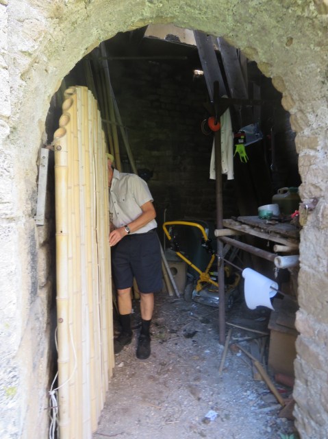 I give you the inquisitive man to whom I am married. He does like to look closely. In this case, he was interested in the construction of the bamboo door to the tool shed that he spotted at Ninfa. The bamboo will have been harvested from their own plantations in the garden and are a creative solution to crafting a door to fit a non-standard entry which likely dates back to the Middle Ages when the buildings of this town were largely constructed. I hasten to add, the door was left open. Mark may inspect but does not usually pry.