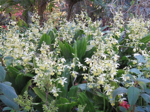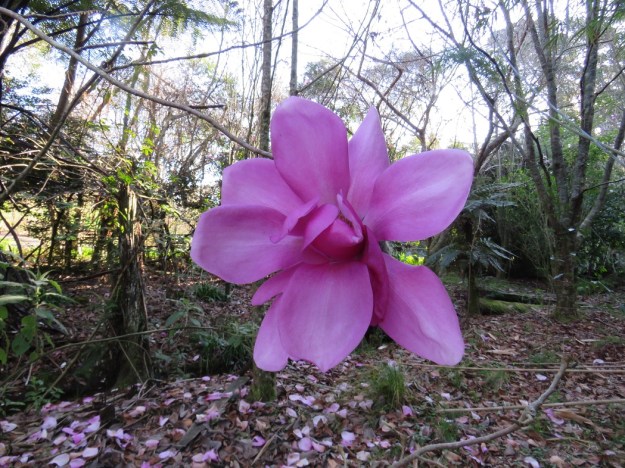 I retrieved this vireya rhododendron from a neglected area at the back of Mark’s vegetable garden and moved it into the Avenue Garden, where I was redoing all the underplanting two months ago. Working in our woodland areas, it occurred to me that if this garden is ever abandoned and left to its own devices, it would revert to a forest of nikau palms, puriri, kawakawa (pepper tree), tree ferns (ponga), karaka and seedling prunus, I pull out seedling nikau palms by the score and remove every seedling prunus that I come across.