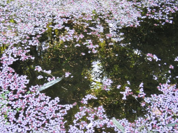 Fallen cherry blossom petals on a pond in the wild North Garden