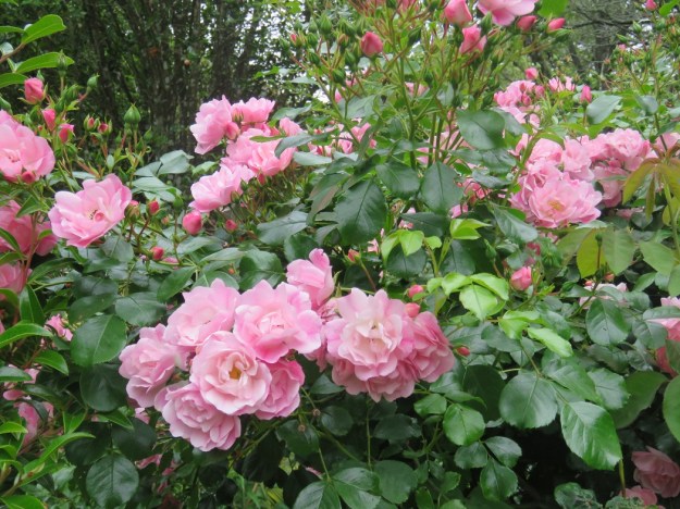 It is satisfying when a plan comes together and this particular border has been giving me pleasure this week. It is very pink and not necessarily a shade of pink that I love but the combination of the piped icing-like kalmia, Flower Carpet roses and pink candlewick flowers of the Justicia carnea works.
