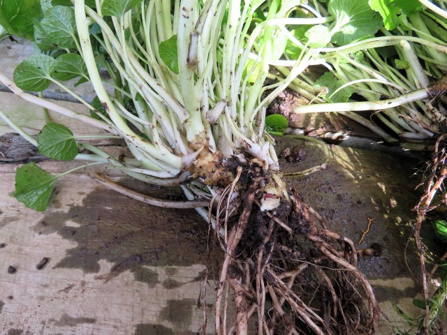 We were given a small division of a wasabi plant last year. Despite the internet saying it was difficult to grow, we hit on ideal spot (fertile soil with overhead cover from a couple of orange trees) and the clump has grown. I could see some evidence of the swollen tubers that are the part that is grated to eat so I dug it up, only to find I was being a bit optimistic. It seems it is a two or three year crop in our conditions, to get big enough tubers to grate. We now have seven divisions, five replanted and two shared with others.