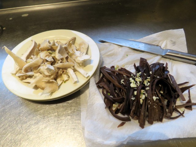 Mark found me some hakeke from the garden for my flavour experiment. I sliced both that and the oyster mushrooms into thin strips and cooked them in butter with a touch of olive oil (to stop the butter from burning) and some finely diced garlic, using separate frypans.