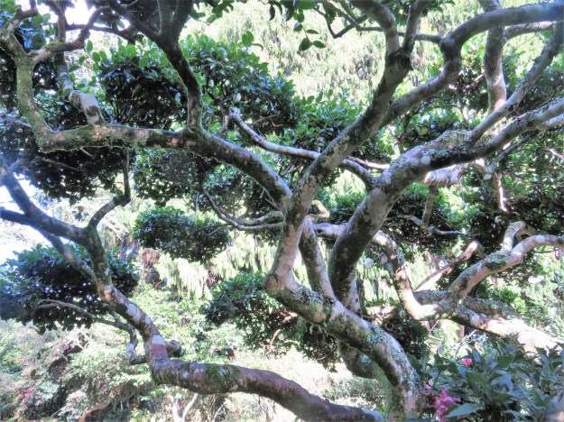 Our garden is very light on ornamentation. We don’t go in for sculptures, statuary, pots or a plethora of trellises and archways, preferring to use key plants as focal points, along with natural vistas. Mark’s cloud-pruned camellias are particularly fetching. He started on Camellia sasanqua ‘Mine-no-Yuki’ which was so huge that its weeping growth was blocking a pathway. The initial shaping took him several days up and down the ladder which was hard on his knees. He must have removed well over half the jumbled plant but found the most pleasing shape beneath. We keep it clipped to flat- topped cloud shapes. It only needs trimming once a year to maintain that form and that is a simple job that takes a couple of hours with hedge clippers. ‘Mine-no-Yuki’ is not good in bloom here. We get a few days of pristine white blooms before they get weather damaged; from then on we get a display of brown and white flowers. As a clipped, evergreen shrub it makes a splendid feature all year round.