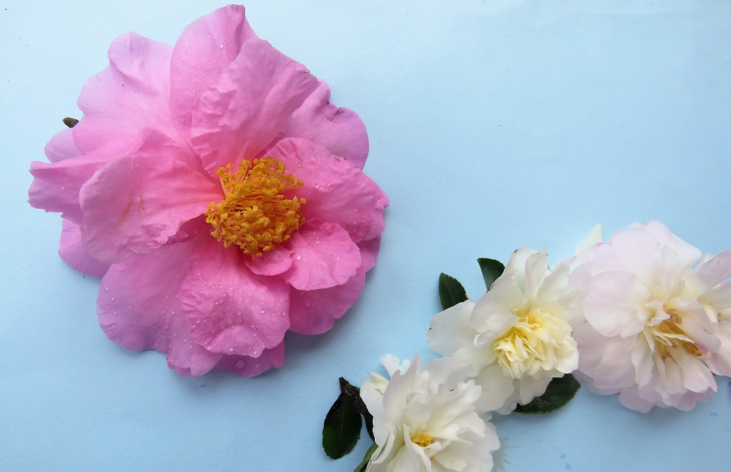 We also have a good representation of autumn flowering varieties from the C. sasanqua group, which are not affected by the blight. In the days when the large flowered C. japonica were favoured, with a particular preference for the perfection of formal doubles like ‘Dreamboat’ and scores of others, the attitude to C. sasanqua was bit dismissive. They lack the solid petal texture and defined form in their blooms and are slower to establish, as nursery plants at least. In New Zealand, they were largely seen as utility hedging, best in white and even better if C. sasanqua ‘Setsugekka’. The white ‘Setsugekka’ hedge became a cliché.