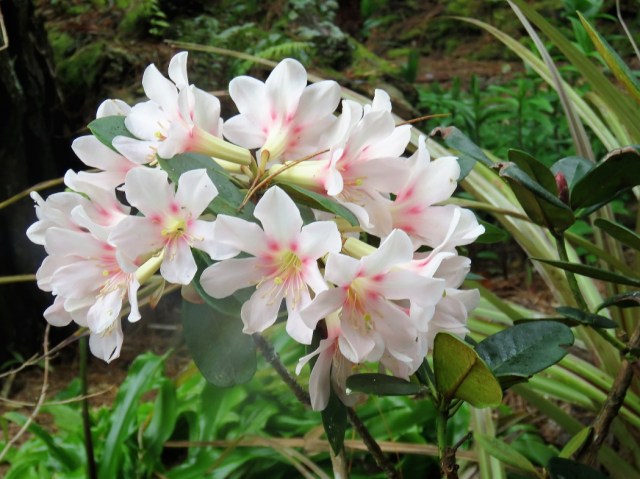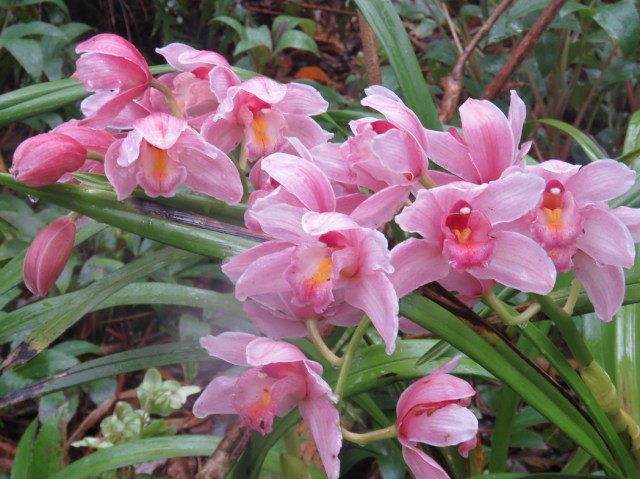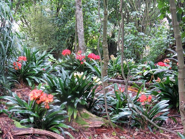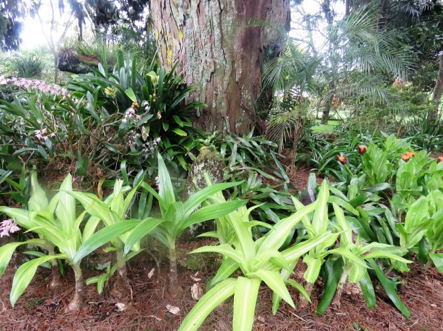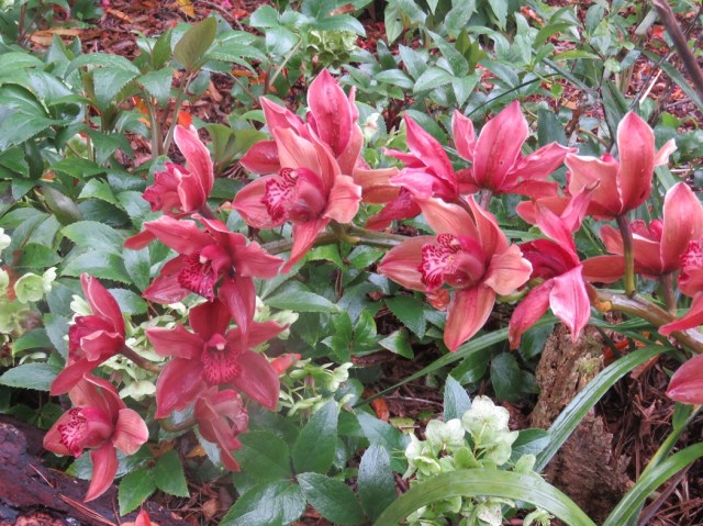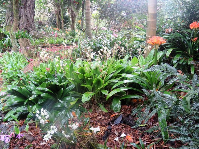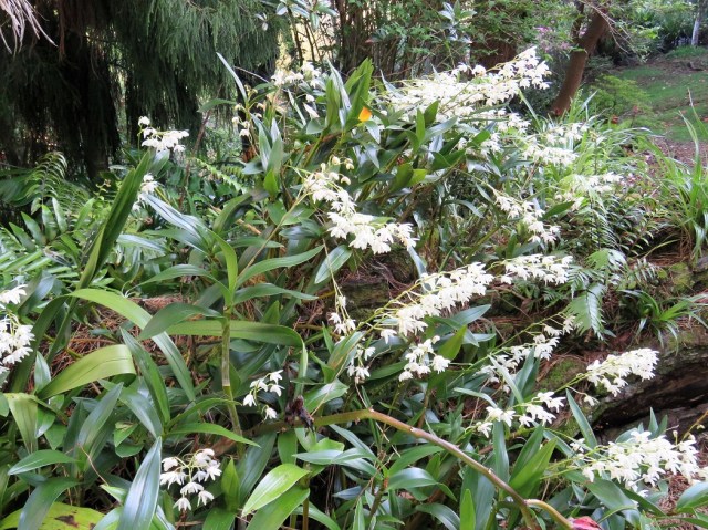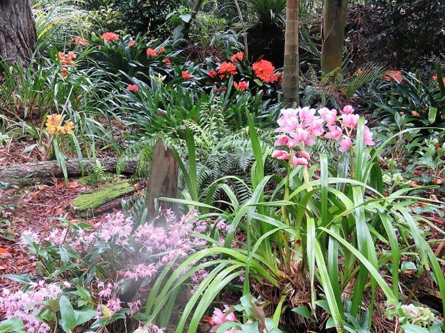 The calanthes are ground orchids and we have big clumps now because these obliging plants can just be left to quietly increase in size. These are fully evergreen and somewhat frost tender but they are a delightful sight through spring and they combine very well with clivias, ferns and even hostas.