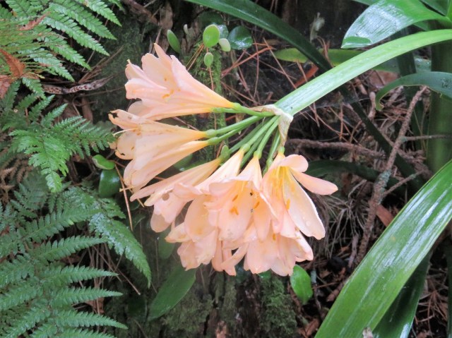 Last month belonged to red Hippeastrum aulicum. This month opened with Hippeastrum papilio. It has taken a few years but we now have plenty of this bulb, able to be counted by the score rather than single figures. It is available for sale and it is expensive to start with – probably around $25 or $30 a bulb. But it is not difficult to grow and it multiplies at a reasonable rate if you quietly lift and divide it every year or two, replanting into well cultivated soil with some compost added. Its flowers are large and showy. Its season was somewhat shortened this year with The Rains. It feels as though it has rained most days this spring. The magnolias and michelias did not appreciate the very wet season and were particularly disappointing. H. papilio tried to bloom and did well enough for me to get this photo. Alas, when I looked a few days later, even with their heavy texture, the blooms had largely sogged out and given up.