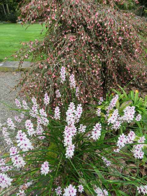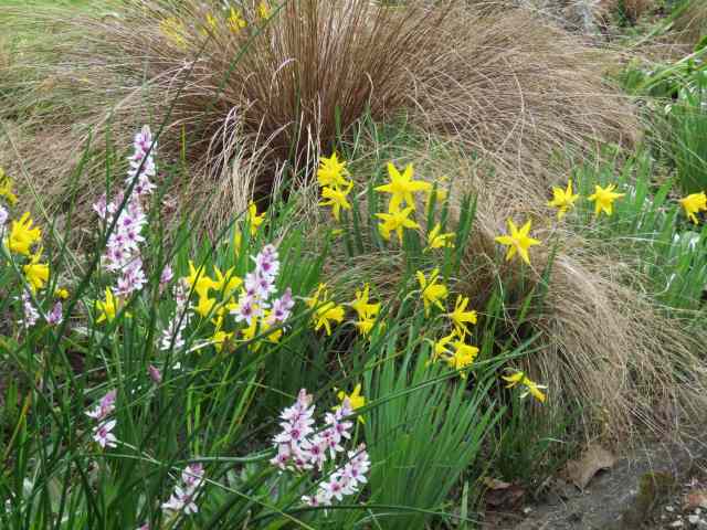 I see the pink and white Onixotis triquetra has been reclassified by some as a wurmbea but I am not sure I can cope with that; it is seen here with cyclamineus hybrids and our native brown carex grasses. We favour the early flowering dwarf narcissi and those within the cyclamineus group are hands down the best performers in our climate.