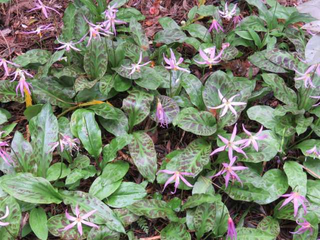 Charming erythroniums or dogs tooth violets – best left undisturbed as much as possible because their long, thin bulbs sit vertically in the soil and are fearfully easy to snap when digging.
