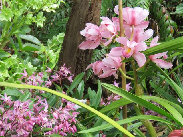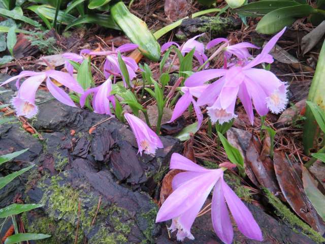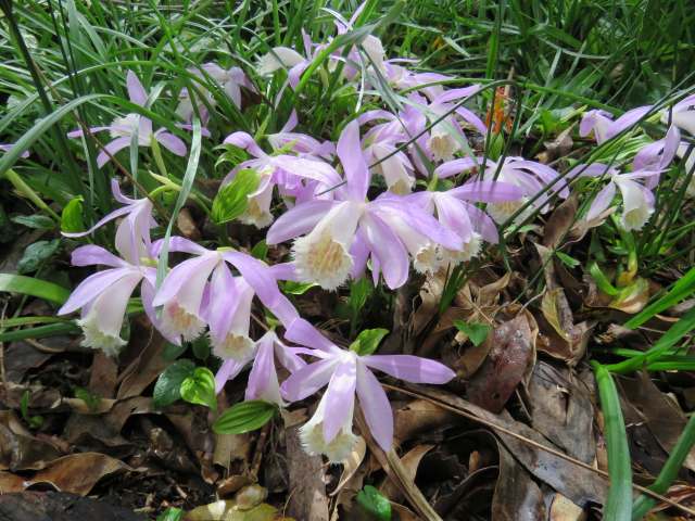 Orchids, we have a few. These are pleiones. We lost all the yellow ones that need more of a winter chill but the purple, lilac and white varieties thrive under laissez faire management in the woodland garden.