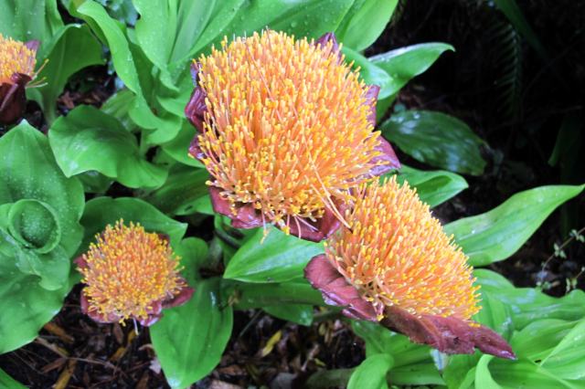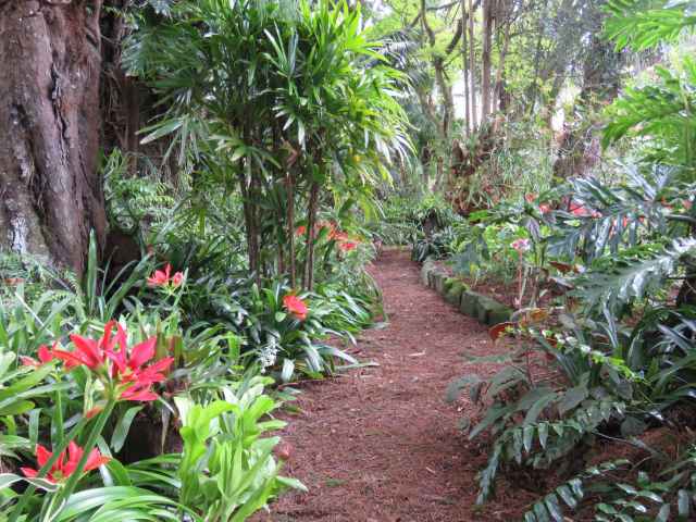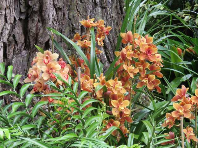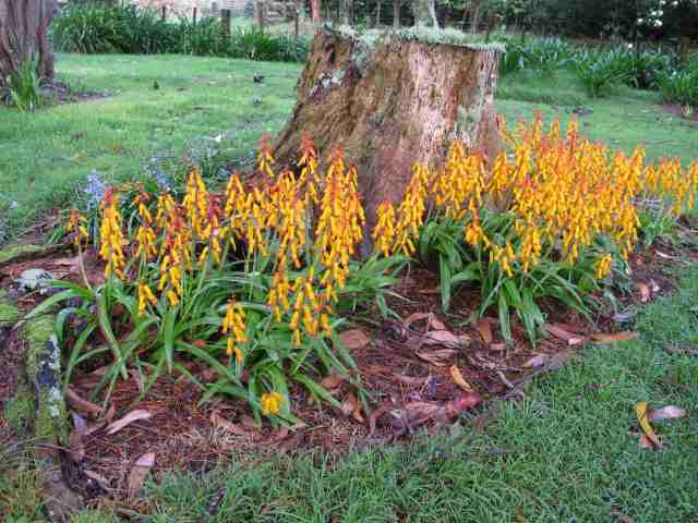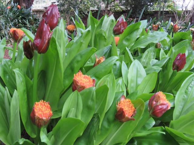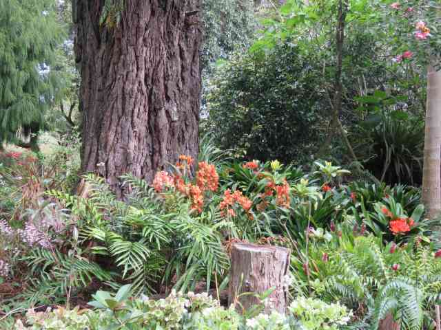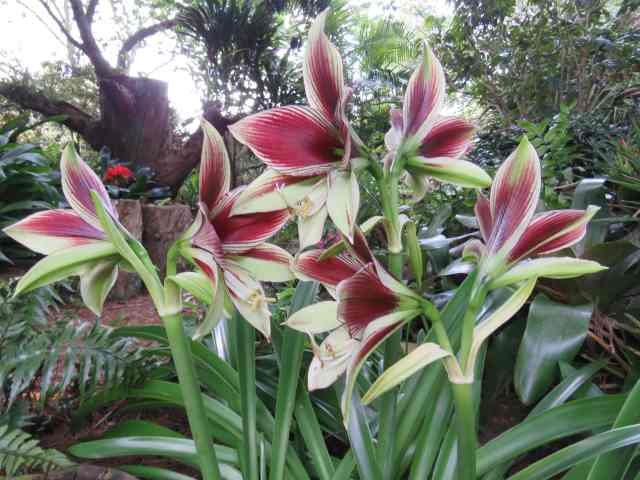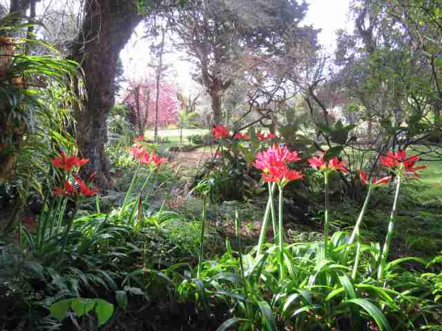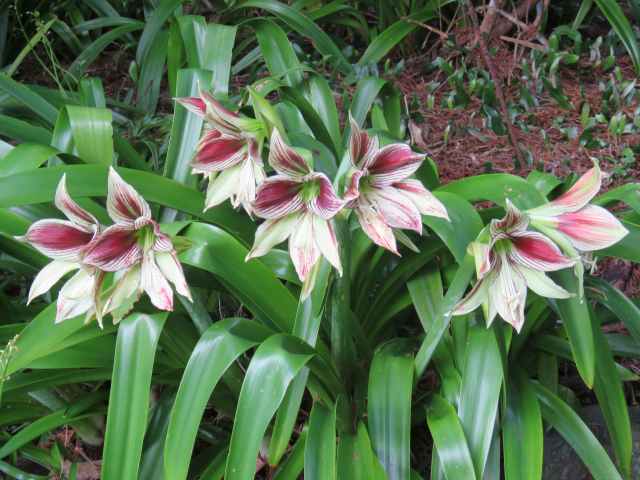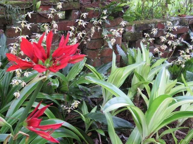 Red Hippeastrum aulicum, pale yellow calanthe orchids and Crinum moorei varegata are all mainstays of our woodland plantings