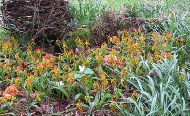 Lachenalia aloides tricolor on the margins of woodland where light levels are higher. With a white trillium popping up through them and snowdrop foliage to the right.