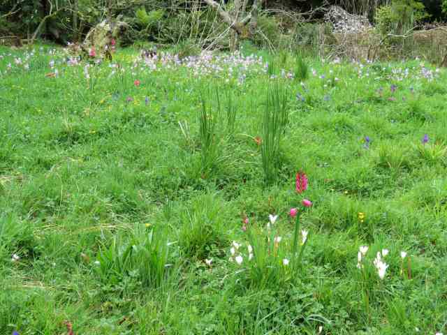 The meadow we are developing in the Wild North Garden with a scatttering of bluebells, but mostly pinkbells, at the top of the photo