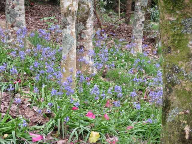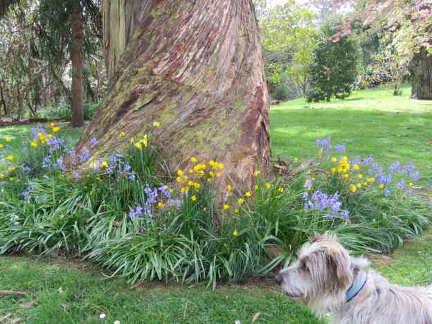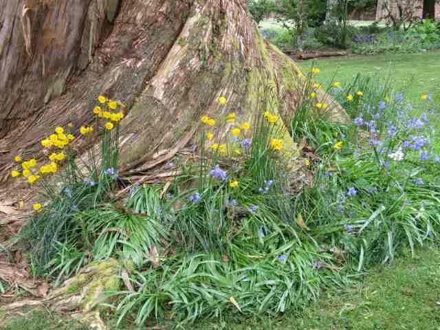 Bluebells are fine in this situation, around a tree trunk where they are contained by mowing. The narcissi are bulbocodiums and you can tell the tree is a eucalyptus by that interesting twirl on the trunk.