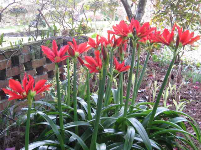 Hippeastrum aulicum – we plant it in semi shade to shaded areas because it will still flower and the dreaded narcissi fly only attack plants in sunny spots