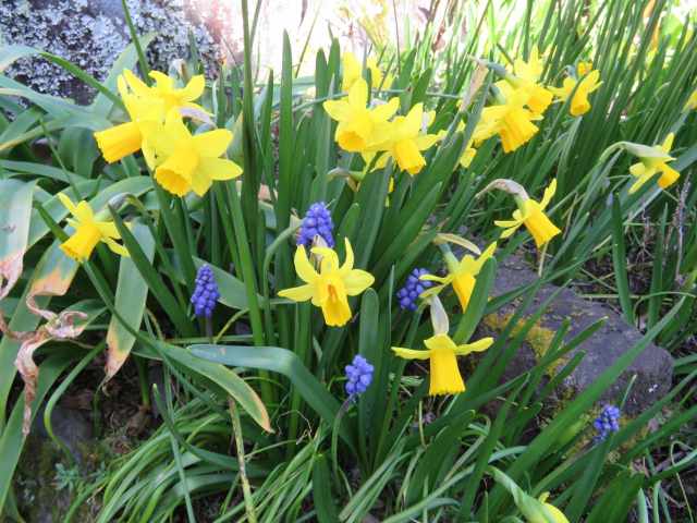A touch of grape hyacinth is enough. Seen here with Narcissus Tete a Tete.