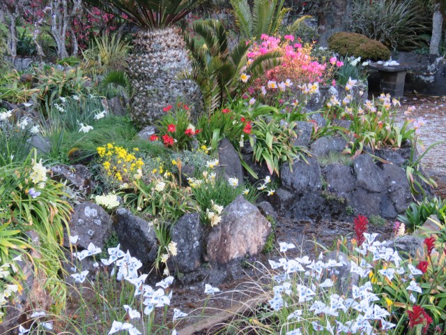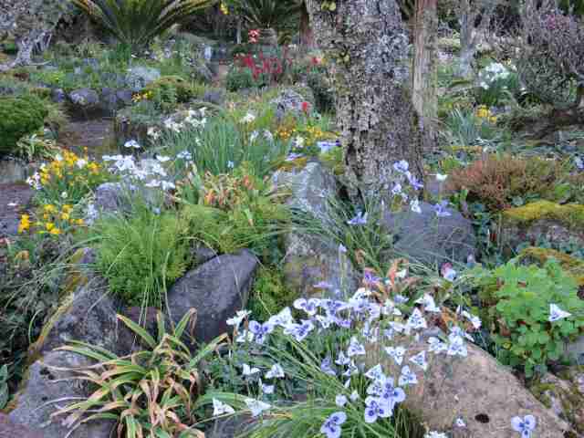 There is a large group of somewhat messy bulbs that are terrific in flower but their seasonal foliage is often dying, either just before they bloom or while they are in flower. So they are not nice, tidy, neat bulbs but they are generally showy. The Moraea villosa float like ethereal eyes of the peacock feather, moving in the breeze and they are a delight, even though I may feel irritation at their messy foliage in a few weeks’ time. The freesias (plain cream ones here), sparaxis, valotta, tritonia, Gladiolus tristis and babianas all fall into the same category and are flowering now. We grow them all, but more in the rockery for choicer ones and in meadow plantings for vigorous ones. Their foliage issues are less intrusive than in a tidy border planting.