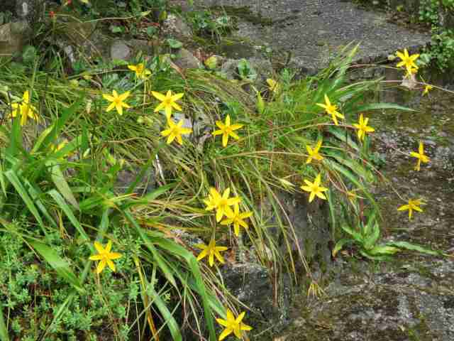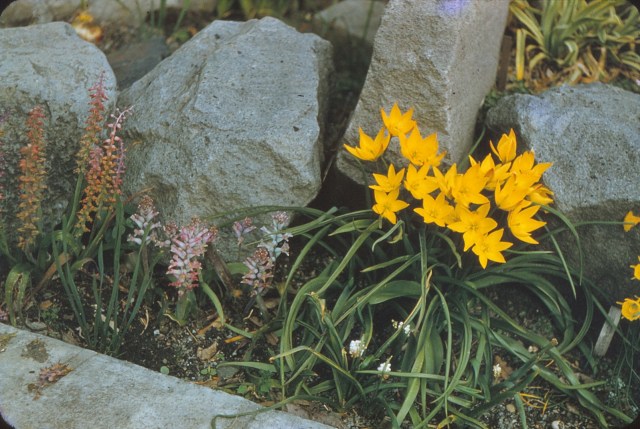 Tulips – we don’t grow the Dutch hybrids but we are enamoured with the Cretan species Tulipa saxatilis. And we have a dainty yellow species that may be a form of T. sylvestris, or it may not. Amongst Mark’s parents’ slides, there was a photo of it in the newly constructed rockery so around 1952 or so. Amusingly, seventy years on, we still have it but only in similar quantity to that in the early photo. It is clearly not going to naturalise and reproduce much here.
