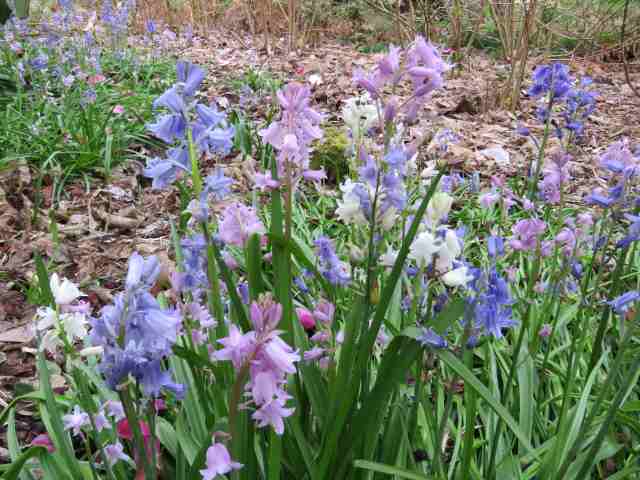 We also enjoy the bluebells in wilder areas, These all grew from seed Mark scattered. The presence of pink and white ones tell you that they are Spanish bluebells.