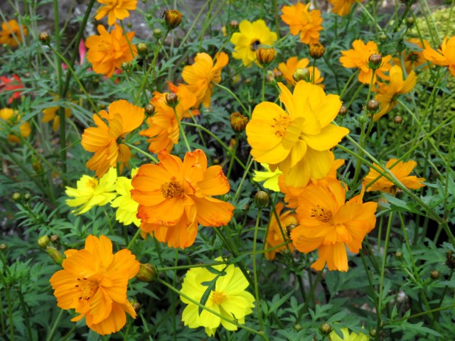 Because the seedlings are reasonably easy to recognise, they didn’t get weeded out but came up, bushed out and flowered in abundance over recent weeks. It is much easier if they can self-seed and not need to be raised from scratch in a seed tray and then planted out again. These cosmos are not subtle; they are perhaps reminiscent of marigolds (tagetes) but a simpler flower with clean colours so I prefer them. Cheerful, they are.
