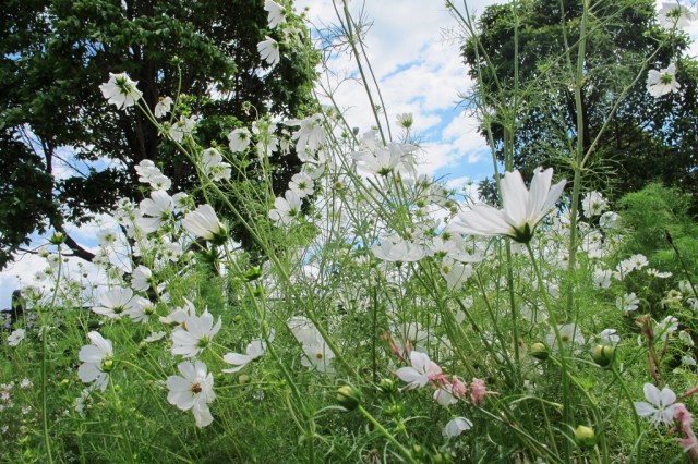 I once photographed these tall, white cosmos in an Auckland garden. En masse, they were absolutely lovely. I even bought a packet of seed in anticipation of something similar in our blue and white Wave Garden but I am not very good with starting from seed – that is Mark’s territory. From memory, my seed was patchy in the extreme and the only plants that grew to flowering size were not pure white but candy pink and white which was not what I wanted at all. Clearly that seed had been collected from a plant that had cross pollinated with a neighbouring pink. Maybe I could try again.