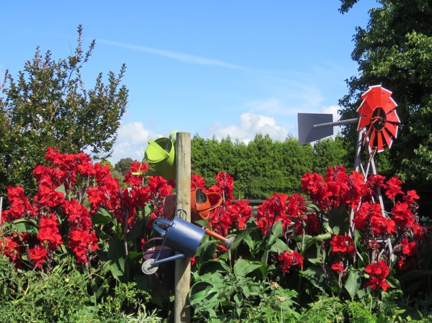 But the fact that I don’t want to grow them myself does not stop me from seeing their merits elsewhere. Down the road, so to speak – as in maybe 5km and a couple of road changes down the road – is a fine patch of red cannas that I admired all last summer each time I passed. They are very… bold. And undeniably cheerful. When passing in a car, they are bright enough to catch my eye every time and they do appear to have a long season in flower. Pat, who owns these, offered me some when I stopped to photograph them yesterday, but I declined. I get my pleasure from looking at them in her garden.