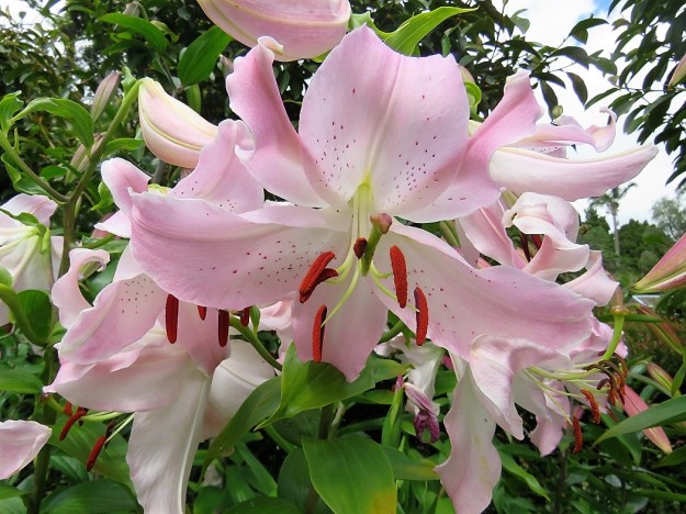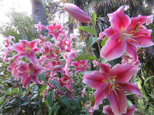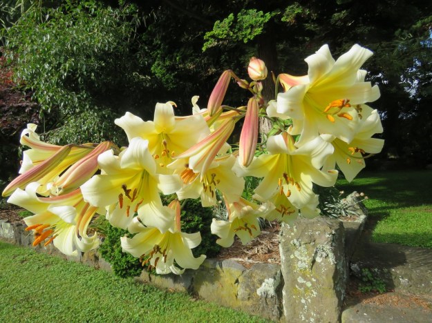 I went back to the Te Henui cemetery this week to take my gardening friend some of the giant albuca she wanted. The dedicated volunteers keep the whole place blooming all year round but it was the lilies that caught my eye this week. One lily in particular was standing sturdy and straight with no staking and reaching a heady height of maybe 1.8m. “What is it?” I asked. “It’s an Oriental, she said. “I bought the first one from a bulb outlet and it is called ‘High Tea’ and the rest came in a mix of Orientals that I picked up at The Warehouse.”