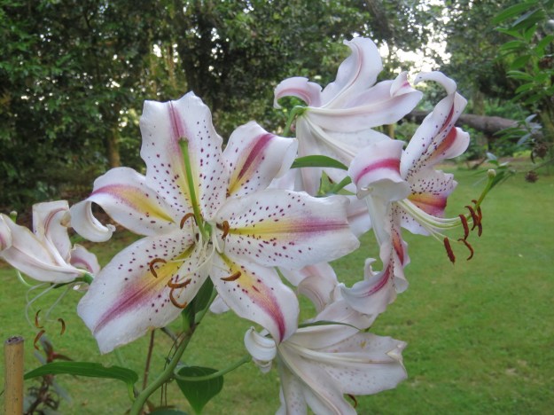 The UK gardening tour I mentioned last week has done been and gorn. It rained, steadily, when they arrived which was disappointing but we moved them all indoors for tea and cakes and the rain stopped a few minutes into the walk around the garden. While hosting these tours takes a bit of work and a surprisingly large amount of mental energy, the visitors often repay the efforts in more than money. Being able to share the garden with appreciative visitors who have a fairly high degree of knowledge themselves – albeit with an entirely different range of plants – is what it is all about really. We don’t garden on this scale just for ourselves and it can be extremely affirming to share it with a group like this one. I have to report that the lilies in the garden did not flower as hoped but we have enough lilies planted “out the back” as we say for me to pick an impressive display for vases indoors and they did not go unnoticed.